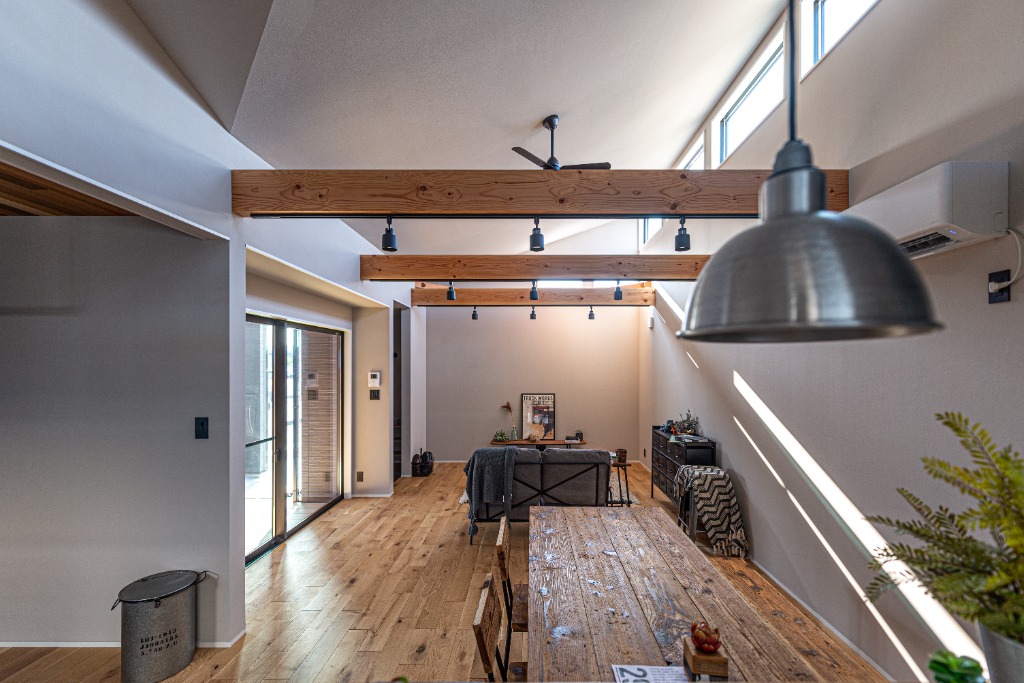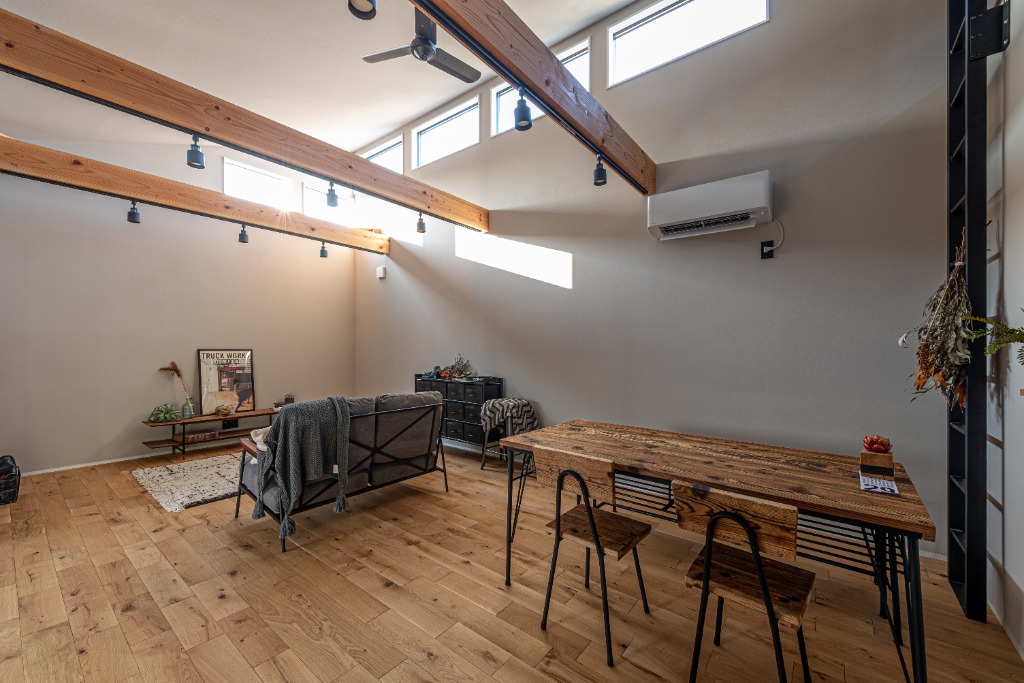 南面の壁はDIYにて収納等を付け足していく事を前提にハイサイドライトのみを広く設置。ディスプレイのイメージで見せる収納にする事で完全オリジナルな好きなものに囲まれたリビングが完成します。