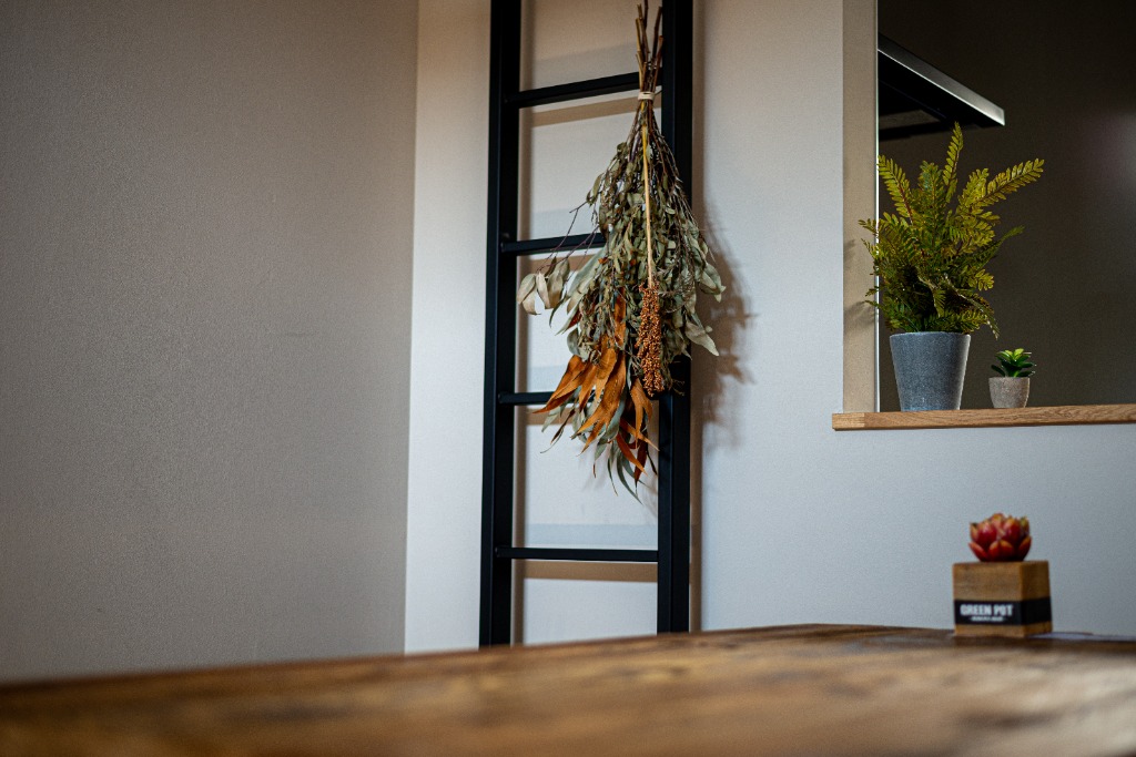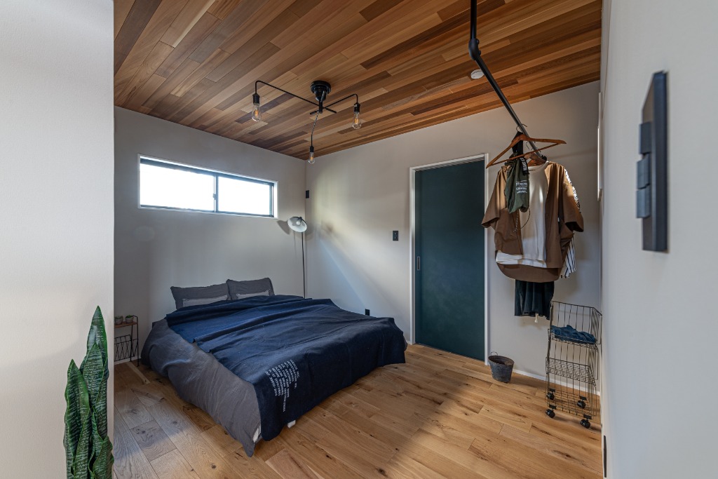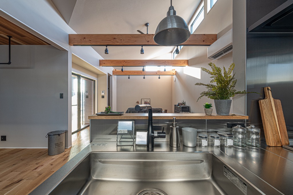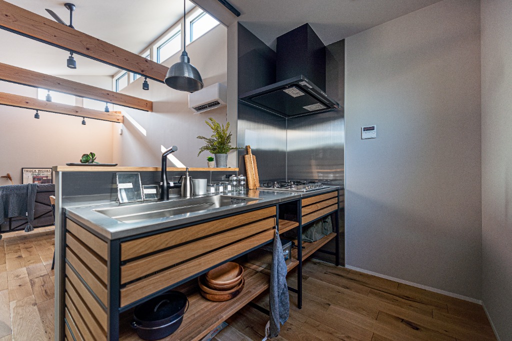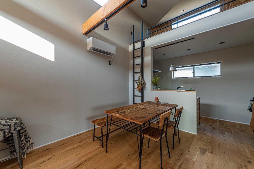 勾配天井を活かしたキッチン上のロフトは、上下の繋がりを感じさせる開放的な拠点です。コンパクトな床面積ながら、垂直方向への広がりと視線の抜けを計算することで、数字以上のゆとりを感じさせます。